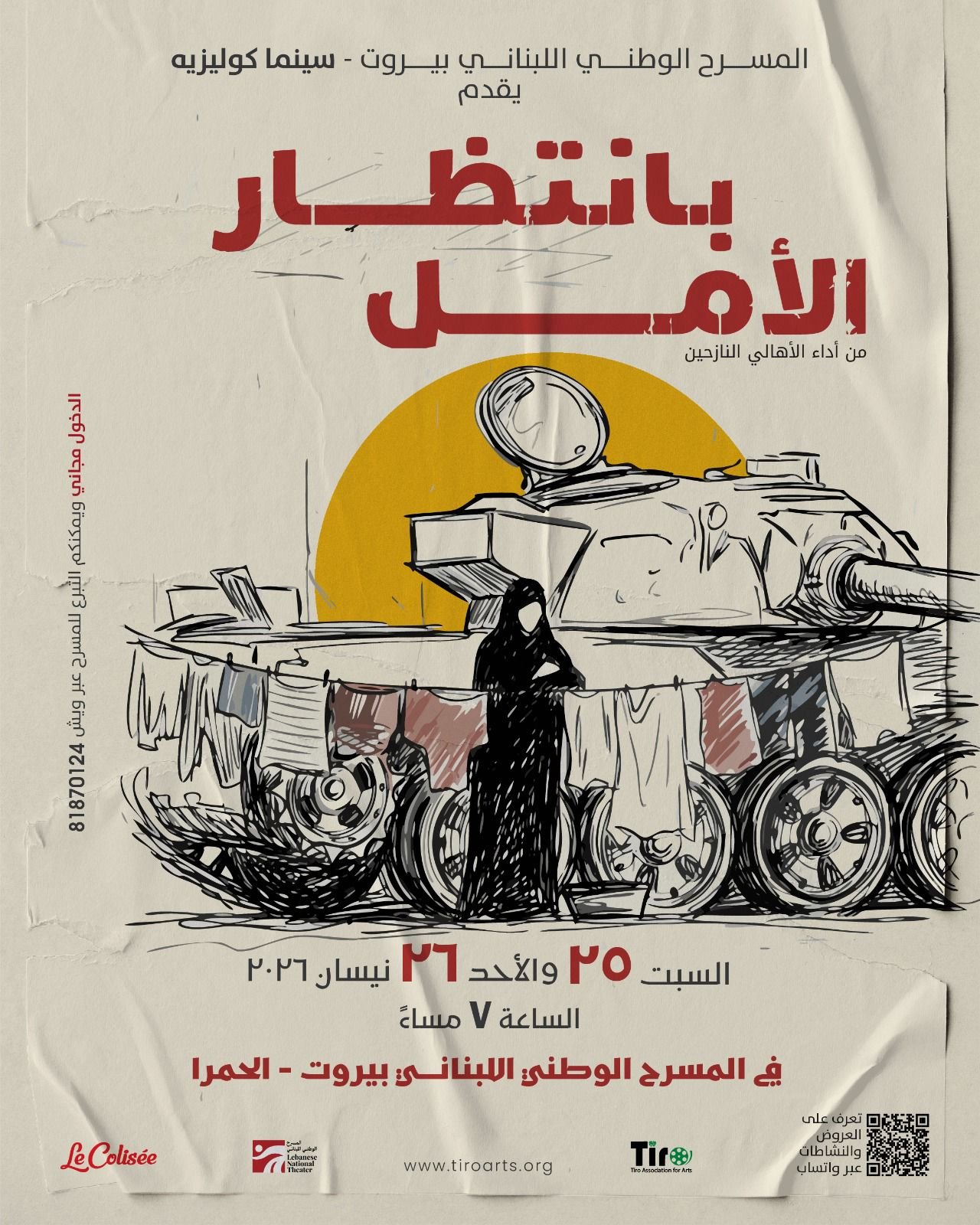 يُعرض “بانتظار الأمل” يومي السبت 25 والأحد 26 نيسان 2026، عند الساعة السابعة مساءً، على المسرح الوطني اللبناني في الحمرا – بيروت. الدعوة عامة والدخول مجاني، في خطوة تهدف إلى توسيع دائرة الوصول إلى هذا النوع من التجارب الفنية، وتعزيز دور المسرح كمنصة للحوار المجتمعي.